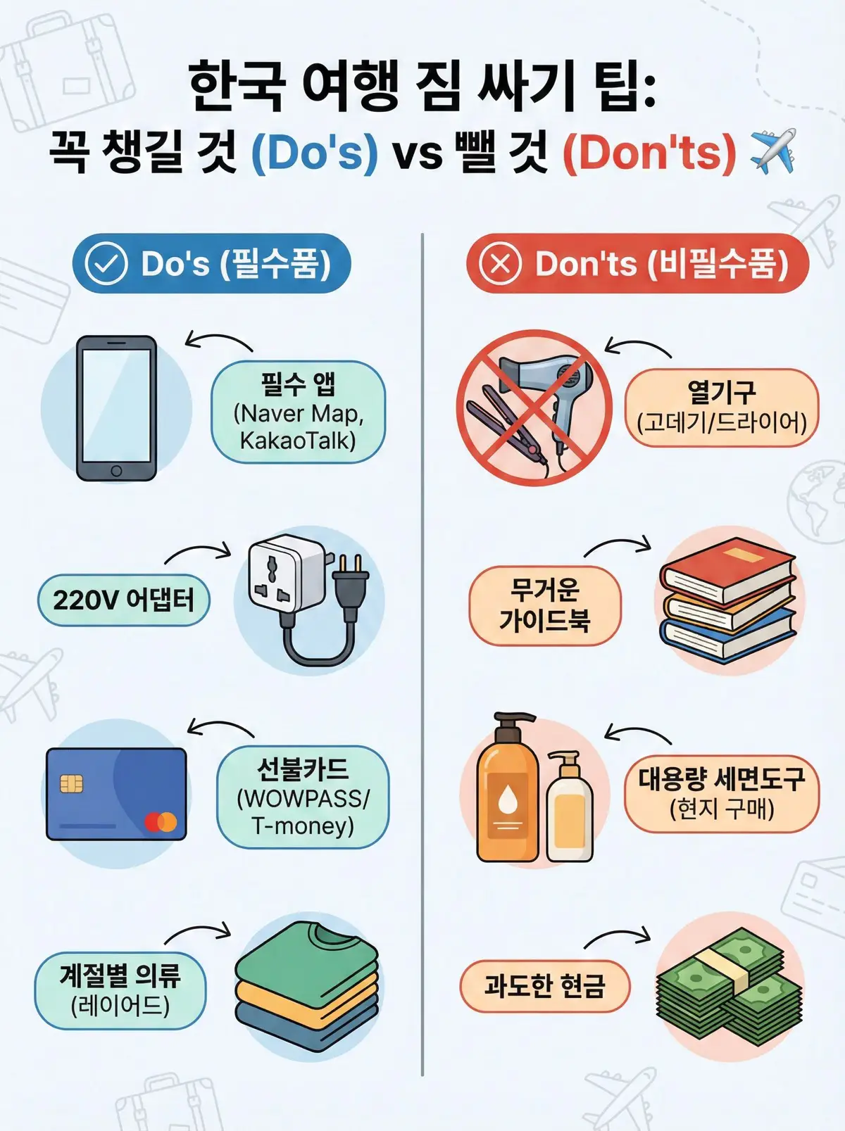 짐을 줄이는 핵심은 '현지 조달 가능 여부'와 '사용 빈도'를 따지는 것입니다. 다음 물품들은 한국 여행 시 가방 무게만 차지할 가능성이 높습니다.